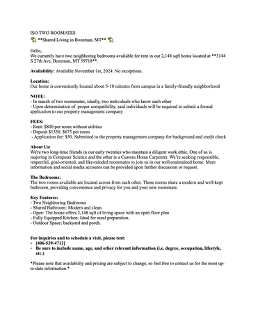 Bedroom 1 . Shared . . Private . $800
