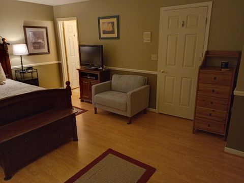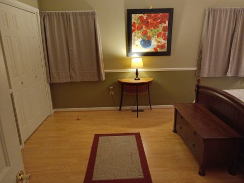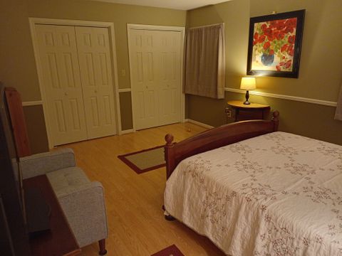 Furnished bedroom with queen size bed, end tables hope chest, large chair and small table & lamps...internet/Wi-Fi free but split utilities.i have 3 active dogs. Retired guy here.