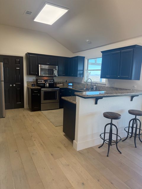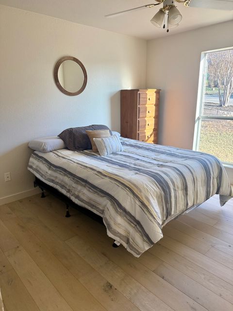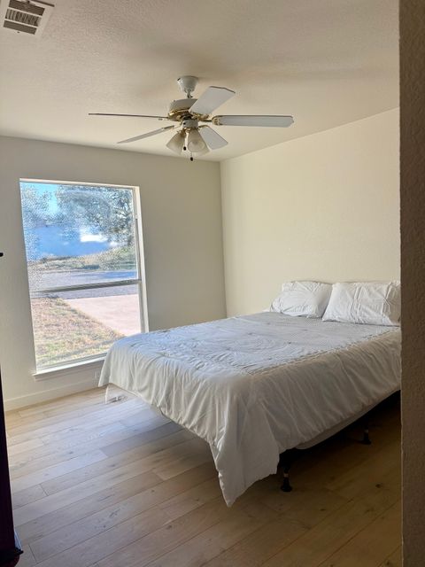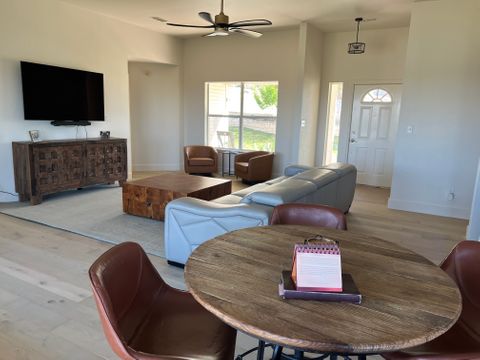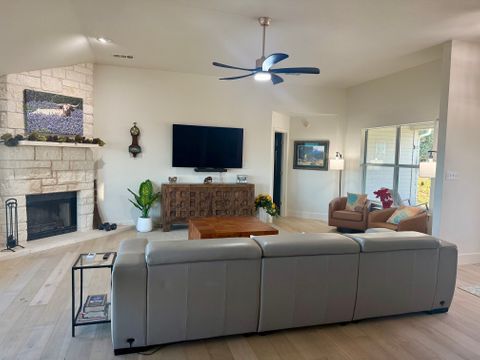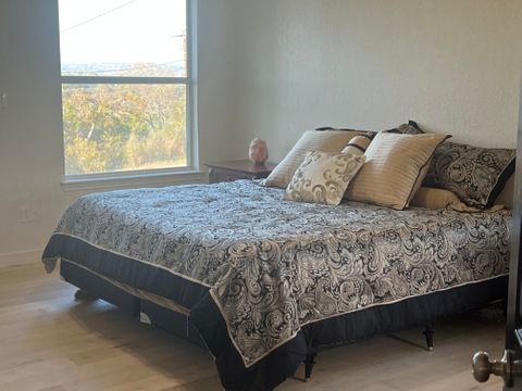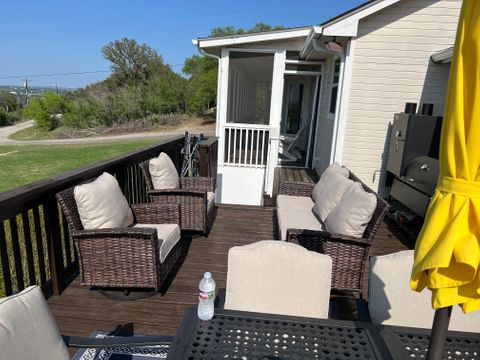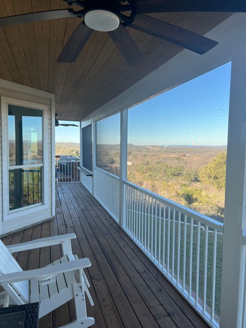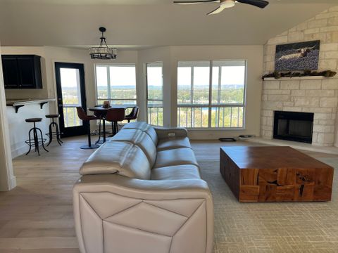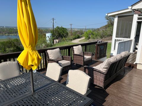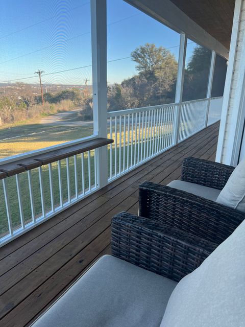 Experience Hill Country living as it should be in this fully furnished, hilltop home overlooking the Colorado River and Lake Marble Falls. Located on a corner lot along a quiet, secluded street, this home offers privacy, calm, and beautiful views—while being just a quick 5-minute drive to charming downtown Marble Falls, where shopping, dining, coffee spots, and local favorites are plentiful. Designed for comfort and easy living, this 1,800-square-foot home is ideal for traveling professionals seeking space, serenity, and thoughtful details that make longer stays feel effortless. The setting feels removed from daily noise, yet remains convenient for both work and leisure. The open and welcoming living area features comfortable seating, an indoor fireplace, and a dry bar with a wine cooler—perfect for unwinding after work or enjoying a relaxed evening while watching breathtaking Hill Country sunsets. A dedicated workspace supports remote work or study, and reliable high-speed internet and Wi-Fi keep you connected. The fully equipped kitchen includes a full-size refrigerator, stovetop, oven, microwave, and all necessary utensils, making everyday meals easy and enjoyable. A dining table seats four comfortably, with two additional stools at the kitchen bar for flexible dining or casual coffee breaks. All three bedrooms are thoughtfully arranged to promote rest, comfort, and privacy, each featuring new Tempur-Pedic memory foam mattresses and ample closet space. The primary bedroom offers a king bed, a private bathroom with double vanity, walk-in shower, and direct access to a 42-foot furnished screened-in porch—an ideal space for quiet mornings or peaceful evenings. The two additional bedrooms each include queen beds and convenient access to the second bathroom with a tub and shower combination. Ceiling fans, air conditioning, and heating ensure year-round comfort, and the home is equipped with a whole-home water filtration and softening system. Outdoor living is equally inviting. Enjoy the front porch seating area for morning coffee or evening wind-down time, or relax on the spacious, fully furnished open deck with beautiful water views—perfect for soaking up the sun or entertaining outdoors. Additional conveniences include an in-home washer and dryer, covered utilities, and private two-car parking in the paved driveway. Outdoor security cameras are present for added peace of mind. Pets are not permitted. NOTE: Tenant screening is required to book the property.