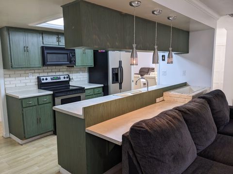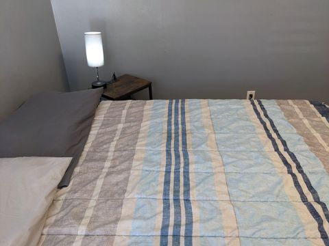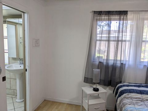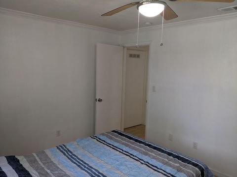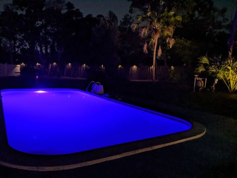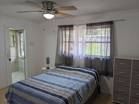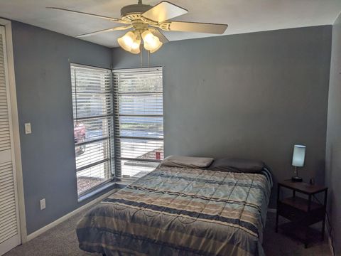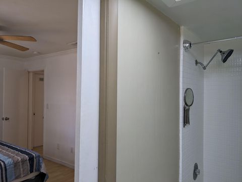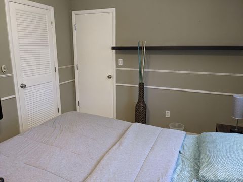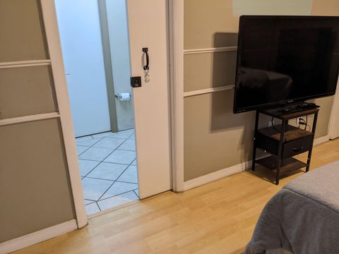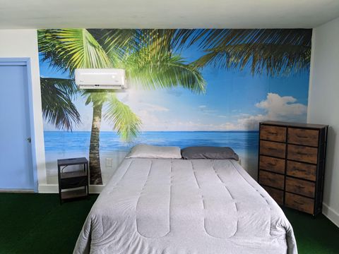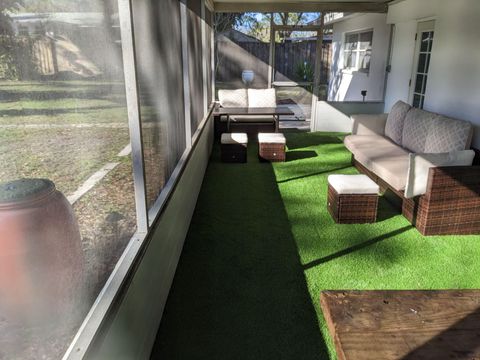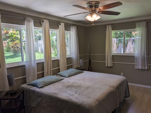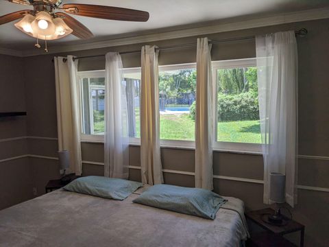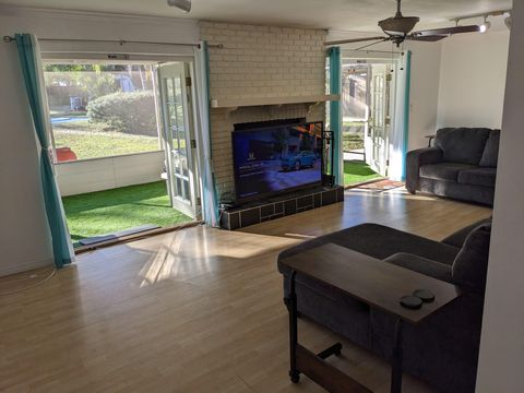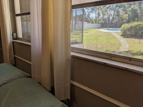 This private bedroom boasts a breathtaking view of the courtyard style backyard and side yard and oversized in ground pool surrounded by lush landscaping. 2 brand new twin sized 12-in mattresses that can be pushed together to form a king size bed or sleep 2 separate guests, full size closet for your travel necessities, and ceiling fan to help keep you cool. Relax in this executive oasis. Enjoy your semi private bath, quick access to screened in Lanai and oversized backyard. Enjoy a full size dresser, bedside table, lamp and Amazon Fire Stick TV or get lost in the relaxation oasis known as the backyard!