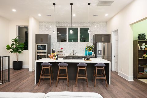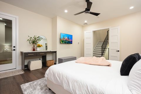 The Horizon | Rice Military – Houston Experience elevated city living in this luxury 4-level, 3,200 sq ft home in the heart of Rice Military—just minutes from Washington Ave, Buffalo Bayou Park, The Heights, Downtown, Memorial Park, and the Galleria. Prime Location • Under 1 mile: Washington Ave & Buffalo Bayou Park • 3–4 miles: Downtown, Theater District • ~6 miles: Galleria & Memorial Park Home Highlights • Premium design & upscale furnishings • Private rooftop w/ skyline views, BBQ grill, lounge seating & mood lighting • Fully equipped Monogram chef’s kitchen (Nespresso, cookware, blender, dining setup) • 75” Smart TV, white noise machines • High-speed Wi-Fi, dedicated workspace w/ ergonomic chair & printer Layout (4 Levels – No Elevator) • 1F: Two queen bedrooms + full bath • 2F: Living room, dining area, full kitchen, terrace, powder room • 3F: Master king suite w/ spa bath + soaking tub & walk-in closet, second queen + full bed ensuite, balcony, laundry • 4F: Rooftop retreat w/ seating, dining area, greenery & BBQ Guest Access • Guest will have access to their private room and shared space. Other bedrooms are locked for privacy. • 24/7 self check-in via keypad Parking • No garage access • Driveway end + free street parking (first-come) Additional Notes • $200 refundable security deposit hold required • Fireplace temporarily unavailable (central heating provided) House Rules • No smoking ($300 fee) • No parties, no unregistered guests • No pets • Quiet hours: 10 PM – 8 AM • Guests are responsible for damages We also have three similar homes next door—group discounts available when booking multiple listings. Corporate and long-term bookings welcome.